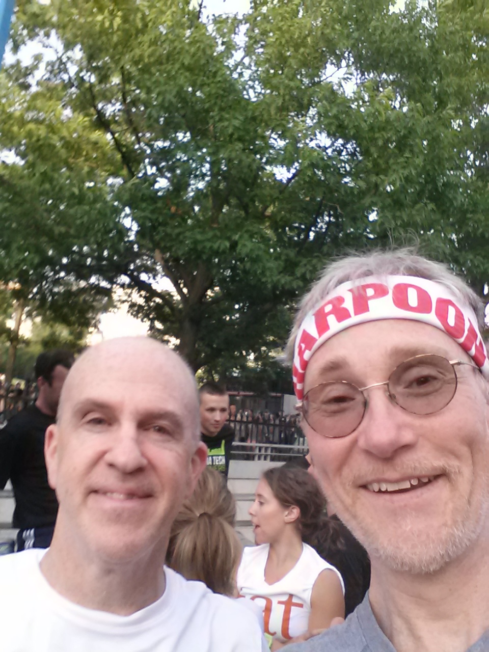 I put out both hands and hit him hard in the chest right on his race bib. I thought I was going to slam him to the pavement, but I don’t think he moved at all. I noticed his running belt or iPhone holder was on the ground. I have no idea how he kneeled down and picked up his gear without getting killed.