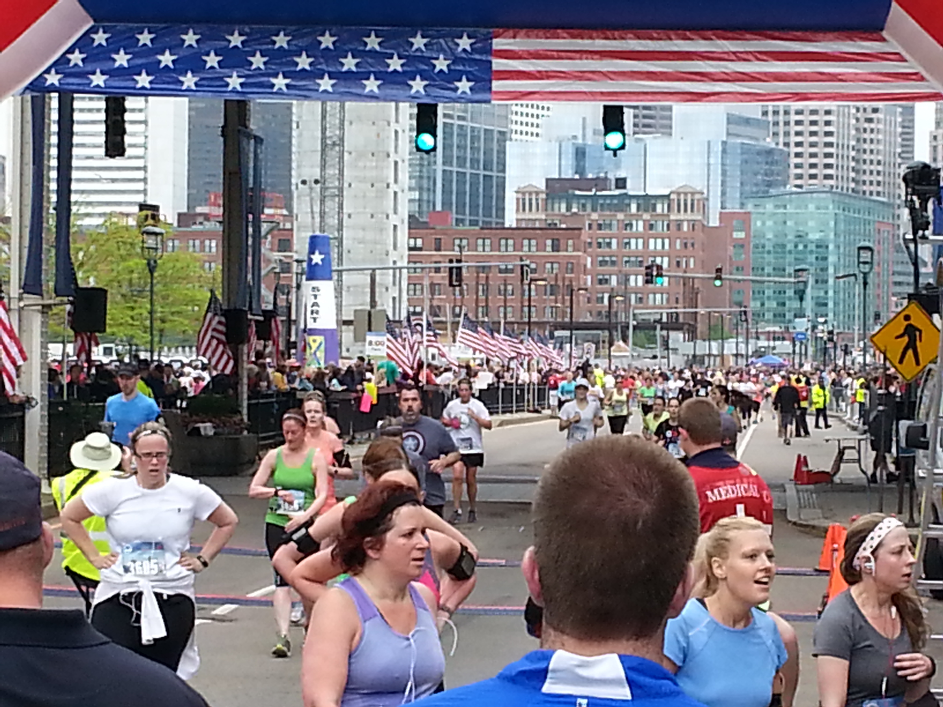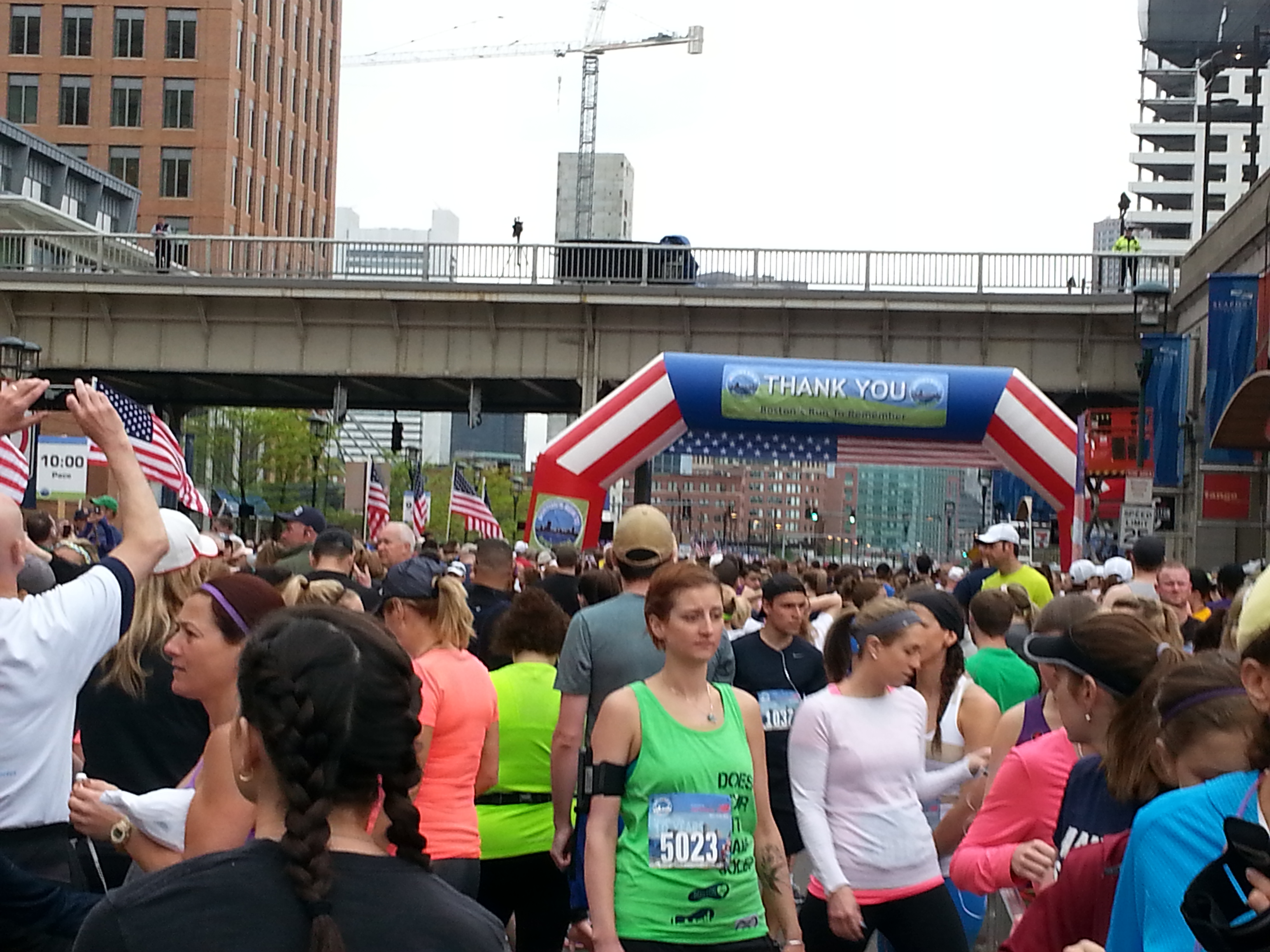 While I was standing there and doing some last minute stretching I saw Jeanne Boisseau making her way through the crowd. I waved her over and we had a fun chat waiting for the race to start. There were a few short speeches and Dave McGillivray quoted Big Pappi about “Boston is our Bleeping Town” and the crowd went wild! They sang the National Anthem and we were shortly off to the races.