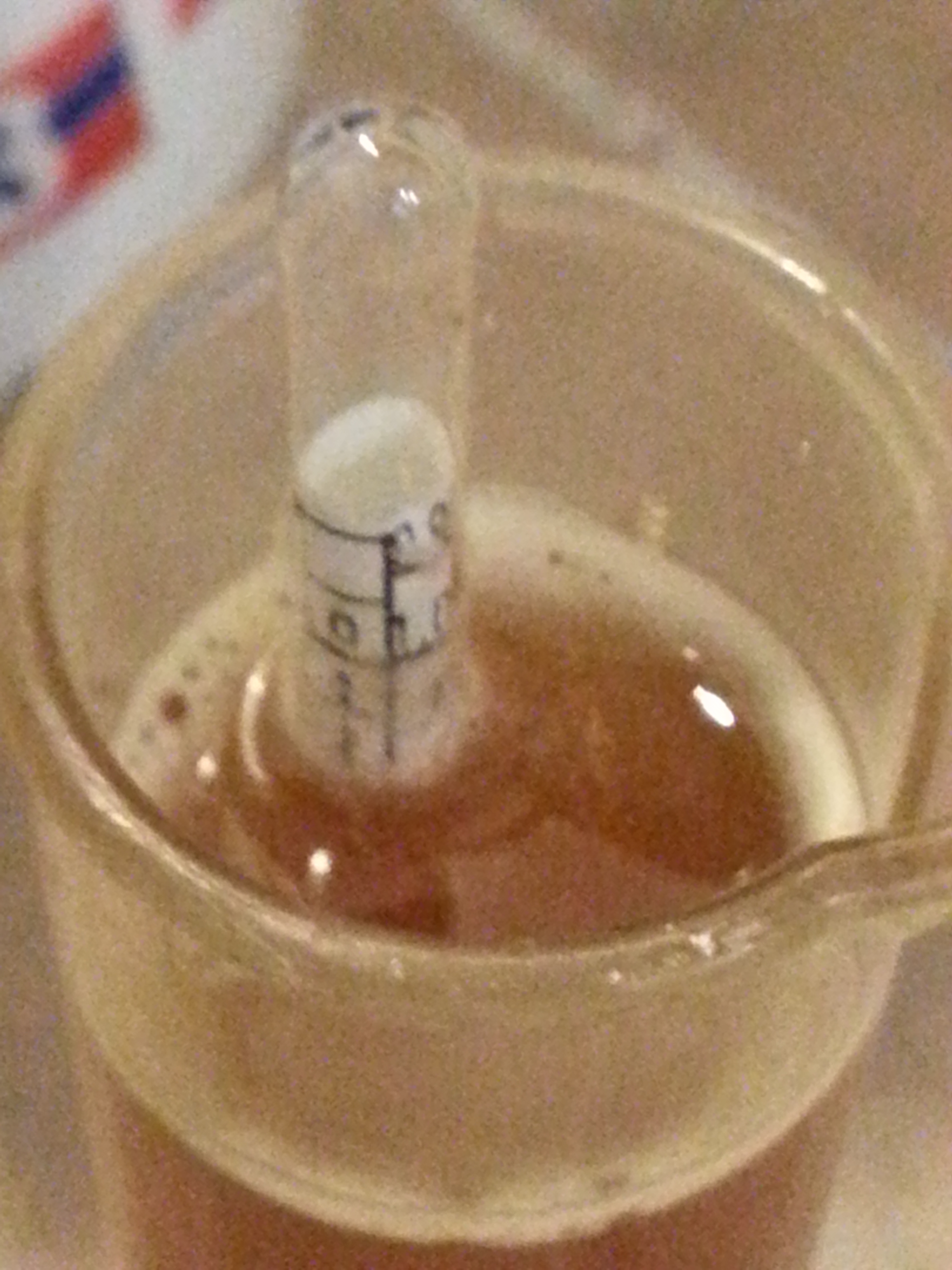 While fermentation looks to be complete, it’s always a good idea to check the specific gravity of the wort. You want to make sure that most of the sugar has been fermented. This keeps your bottles from blowing up during the curing process. The yeast needs some sugar for conditioning, but too much can make a mess and can be dangerous.
