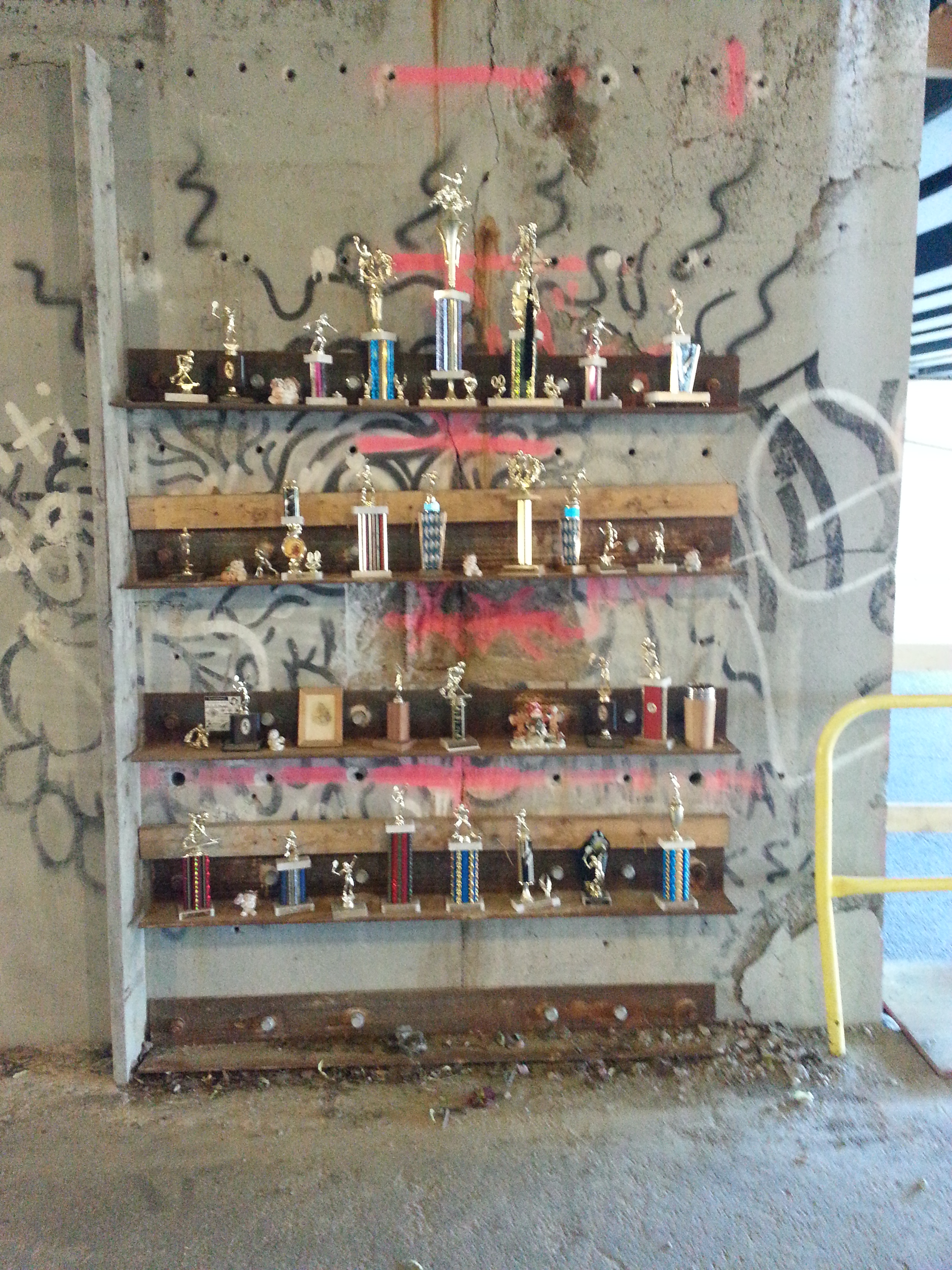I had never seen this urban art before, so I was a little surprised when I realized what I was looking at. It’s been a while since I have been out for a run that took me under the bridge and I have it on good authority that this display has been in place for a few months. Isn’t this really cool? All of these old trophies and knickknacks sitting in public for months and no one has disturbed them.
